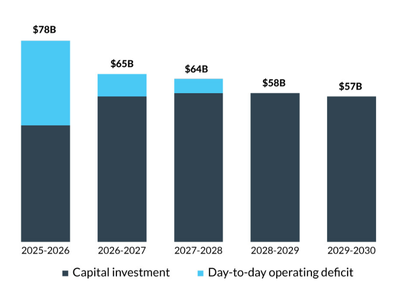 The 2025-26 deficit is a projected $78.3 billion, a significant increase from the $42.2 billion 2025-26 deficit forecast in last December’s fiscal update. This deficit is projected to decline over the next four years to $56.6 billion by 2029-30. To offset this deficit, the government expects to enable $1,080 billion in total capital investment.