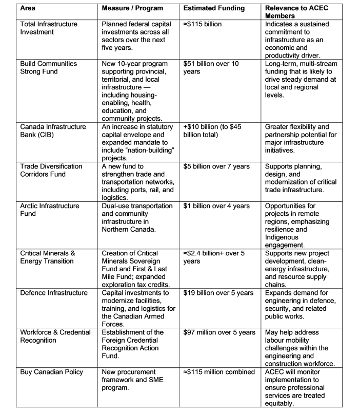 This communication has been prepared by ACEC and its government relations partner First Lake Solutions for the convenience of its member firms. It is not intended as a comprehensive guide to the budget. For details on Budget 2025, please visit the Government of Canada’s Budget 2025 website.